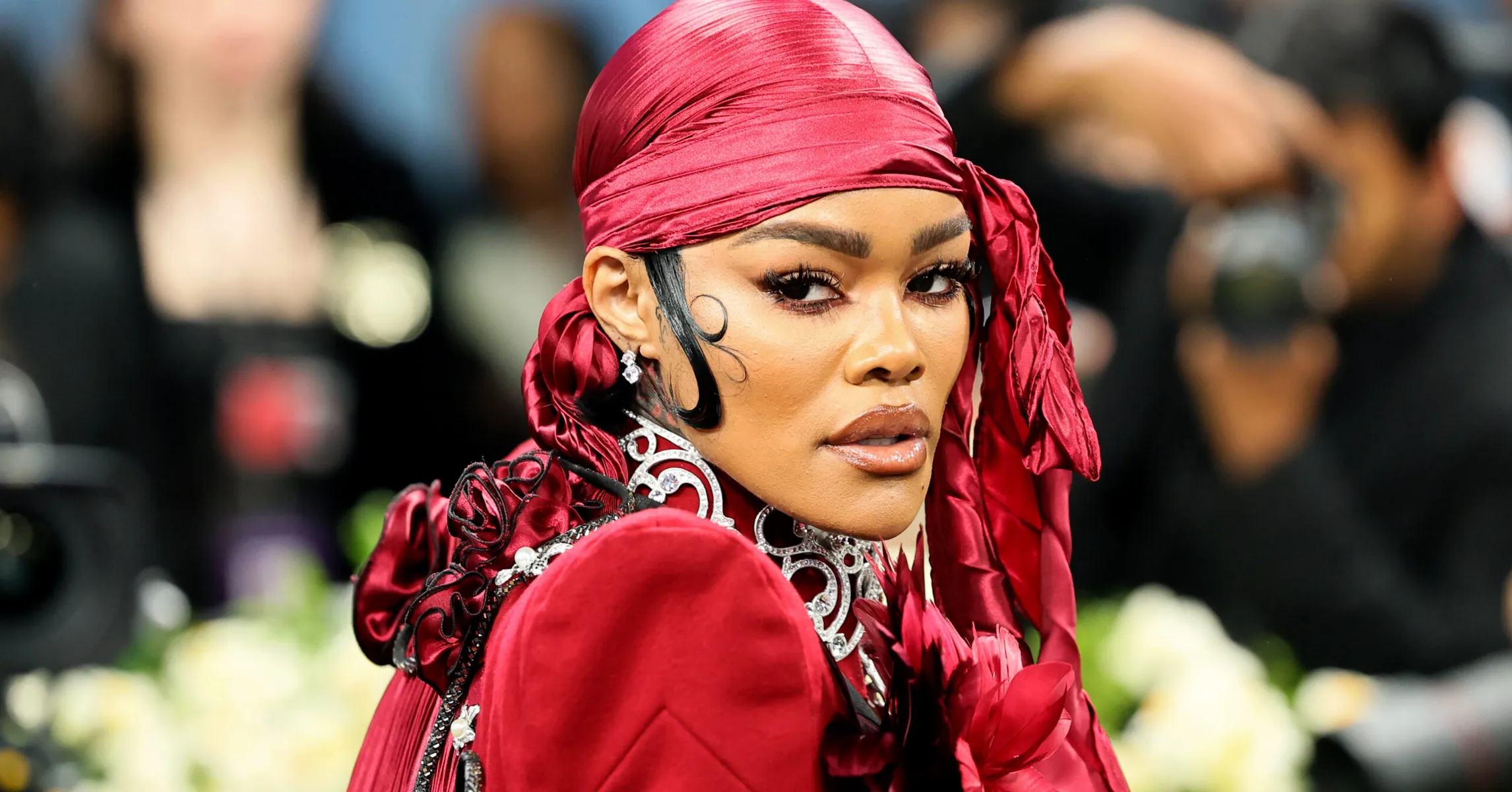 Adorned with intricate fabric flowers and silver pins, Teyana's outfit was a beautiful homage to Black culture and style, redefined by her personal narrative. With red gloves, a cane, and platform shoes, she not only turned heads but also made waves, asserting her identity in a space ripe with creativity.
